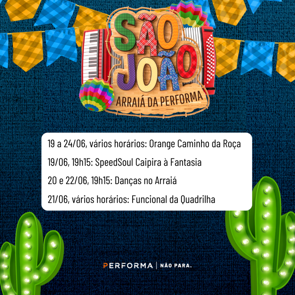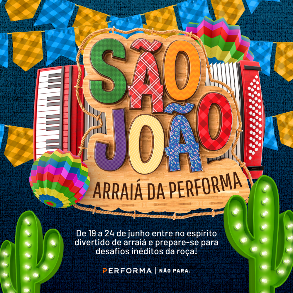 O Arraiá da Performa 2023 está chegando! E vai ter aulas incríveis, de 19 a 24 de junho de 2023. Confira a programação da nossa festa e garanta a sua vaga no APP Performa. Participe!