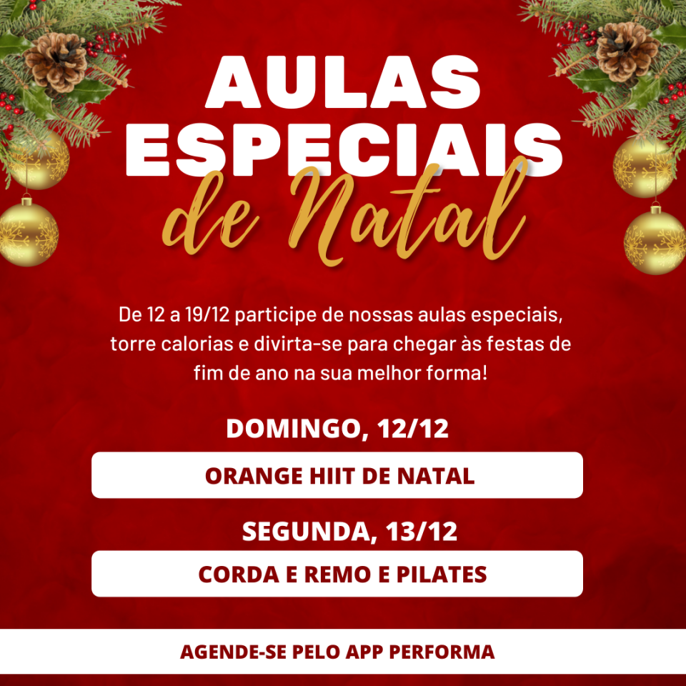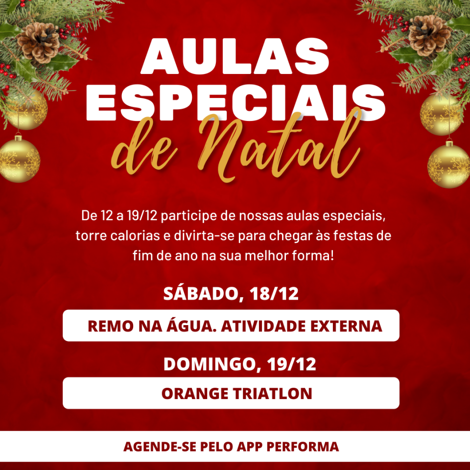 Confira a programação 12/12, domingo: Orange Hiit de Natal 13/12, segunda: Pilates e Corda e Remo 14/12, terça: Bike + Beats 15/12, quarta: Soul Boxe + Yoga a Luz de Velas 16/12, quinta: Heart Dance no Embalo do Natal 17/12, sexta: SpeedSoul À Espera do Papai Noel! 18/12, sábado: Remo na Água. Atividade externa. Últimas vagas abertas na recepção 19/12, domingo: Orange Triátlon