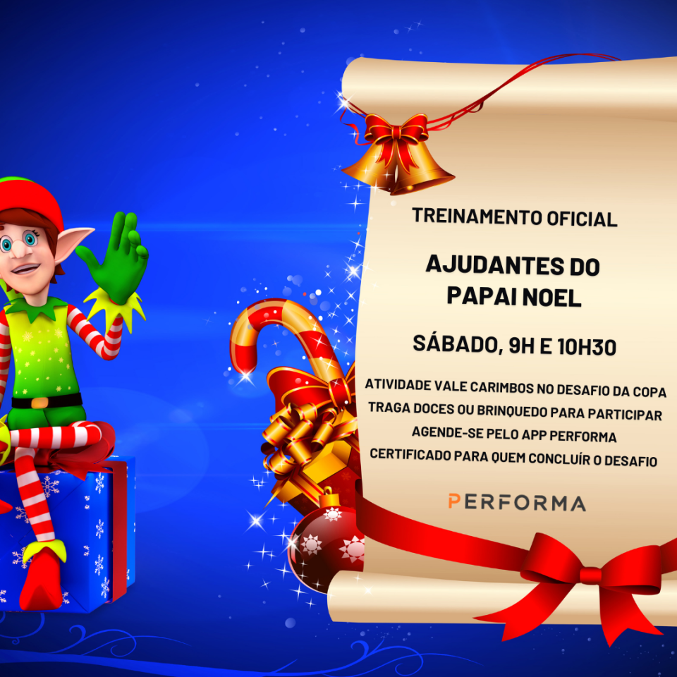 Já que nós da Performa Academia temos fôlego de sobra, vamos ajudar realizando uma pequena volta de entregas para o Papai Noel. Mas não sem treinar a missão primeiro! Por isso, sábado, aguardamos você para o Treinamento Oficial de Ajudantes do Papai Noel. Prova certificada direto do Pólo Norte.